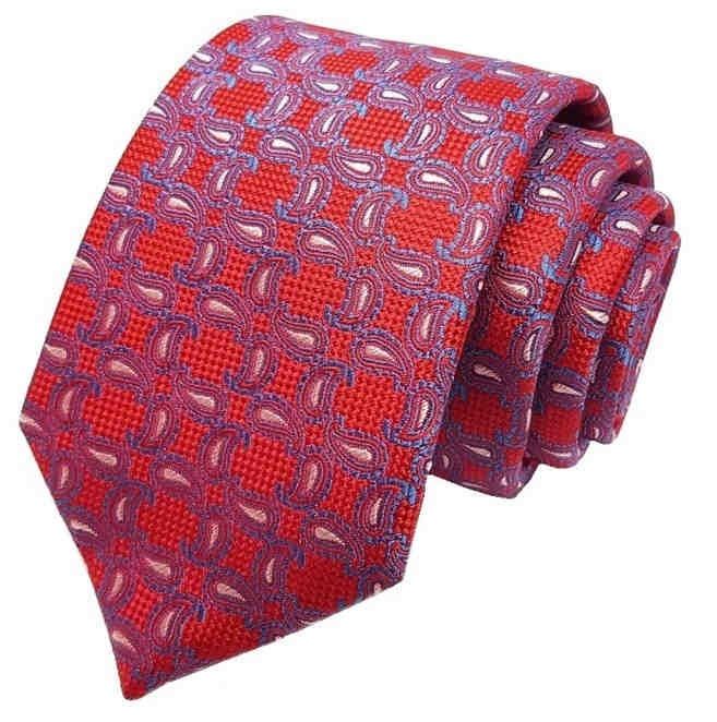 Corbata de Cachemires pequeños pasley en color azul eléctrico azulón y blanco sobre fondo rojo, en forma de cadena haciendo cuadros en ojo de perdiz 100% Seda Natural Jaquard