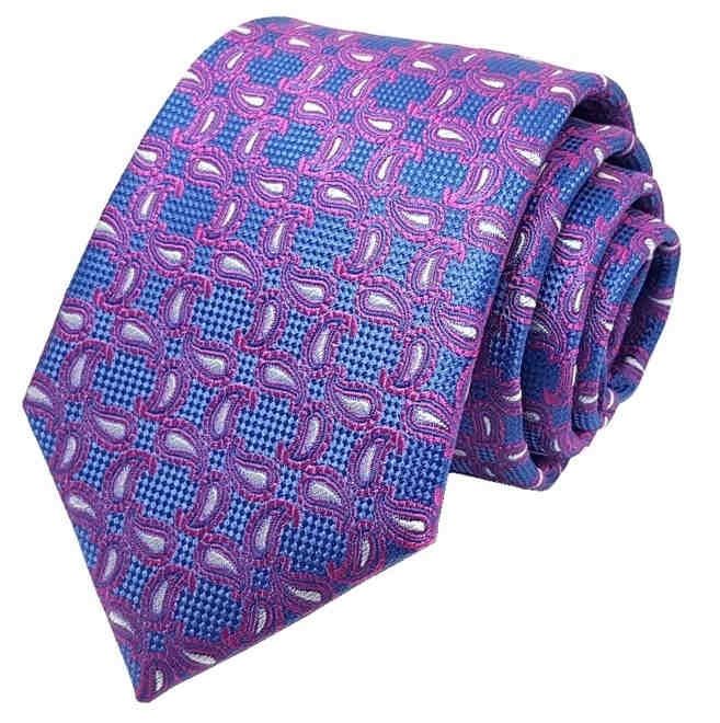 Corbata de Cachemires pequeños pasley en color rosa fucia y blanco sobre fondo azul eléctrico azulón, en forma de cadena haciendo cuadros en ojo de perdiz 100% Seda Natural Jaquard