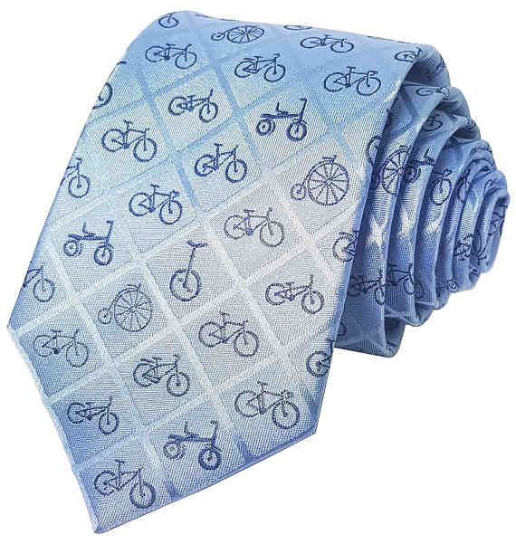 Corbata de Bicicletas Monociclos Triciclos modernos y antigüos en color azul marino sobre fondo celeste y con cuadros rombos al tono 100% Seda Natural Jaquard