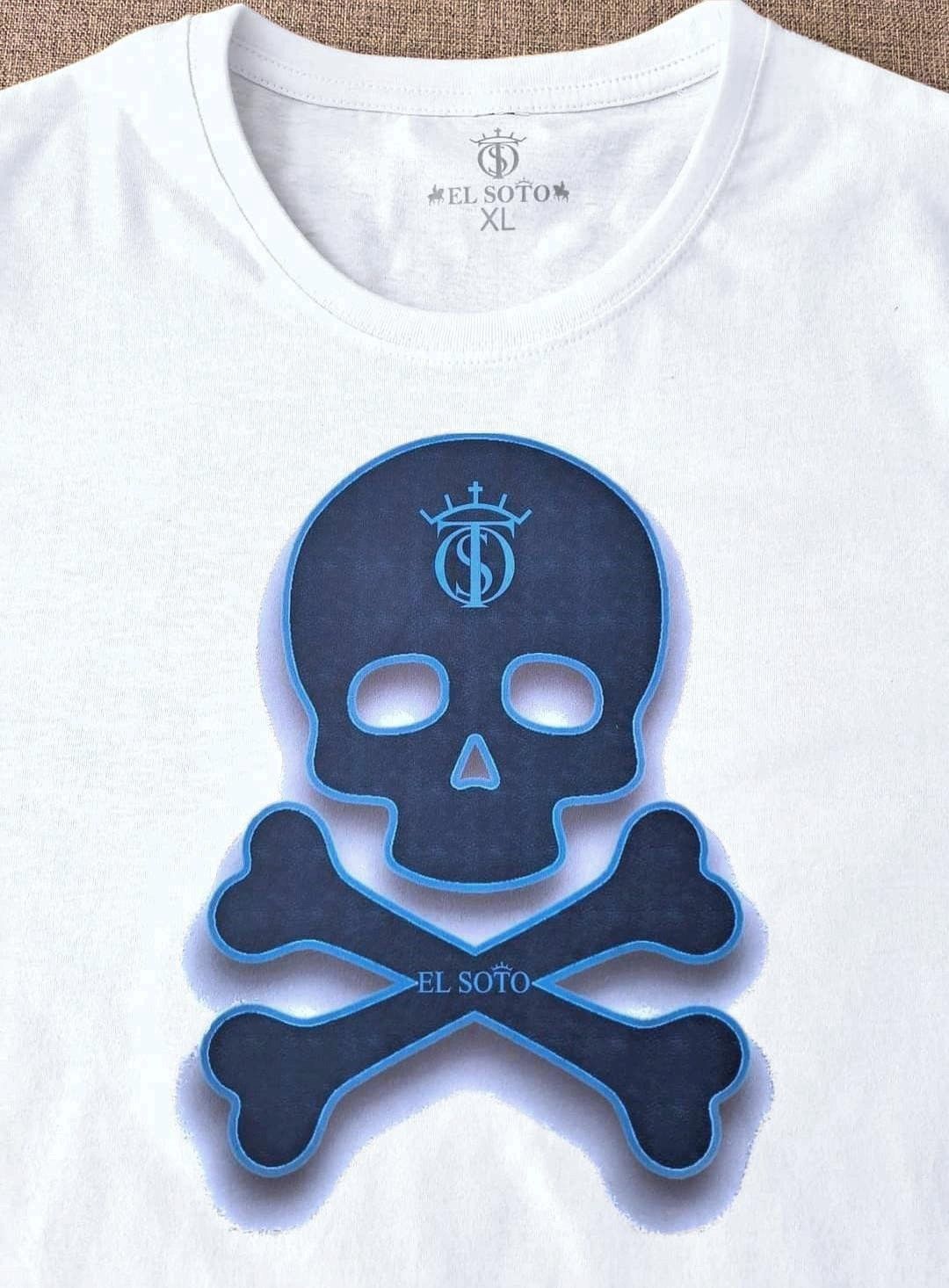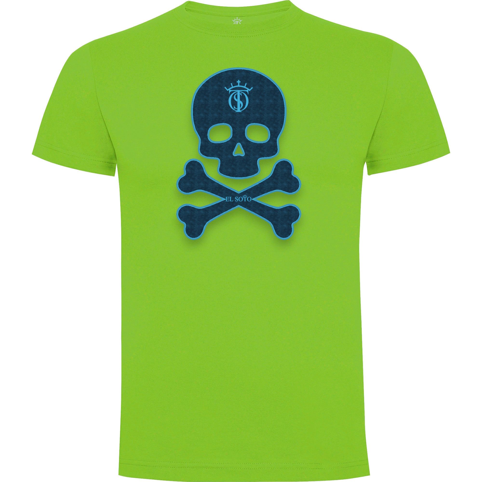 Camiseta de Calavera Azul con efecto cuero bordado y sombras con el hierro en la frente y el texto EL SOTO en las tibias cruzadas pirata 100% algodón en color verde