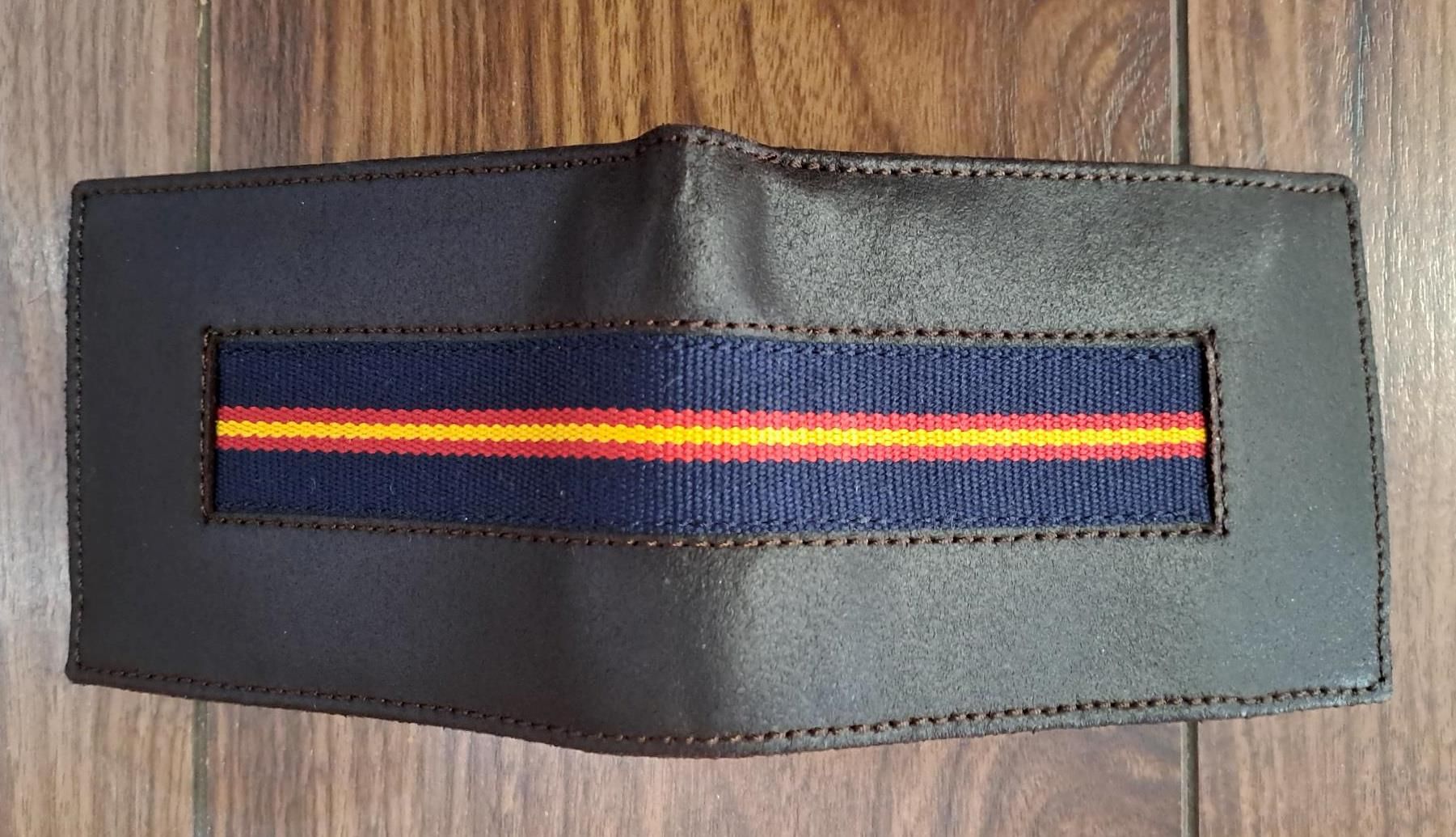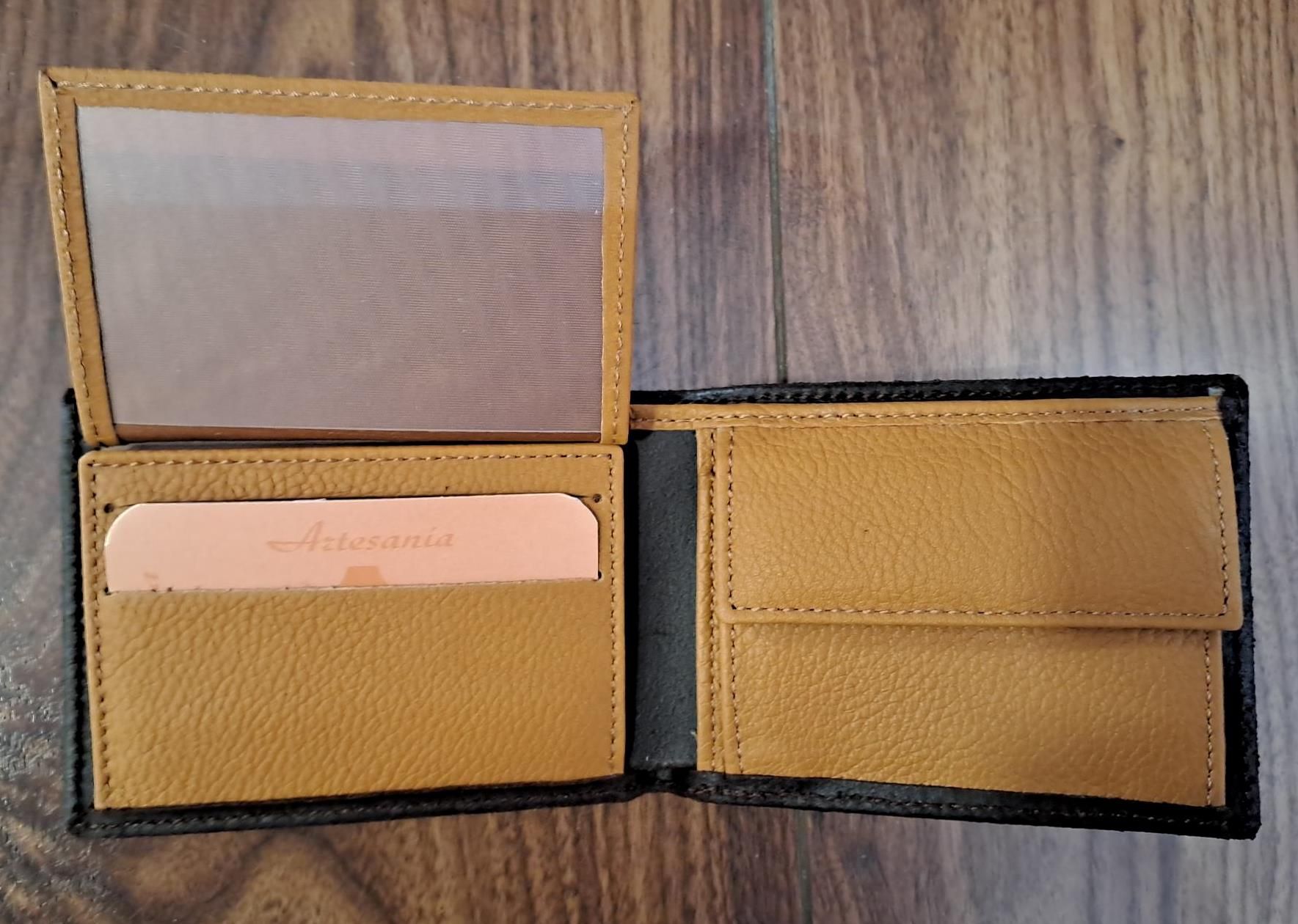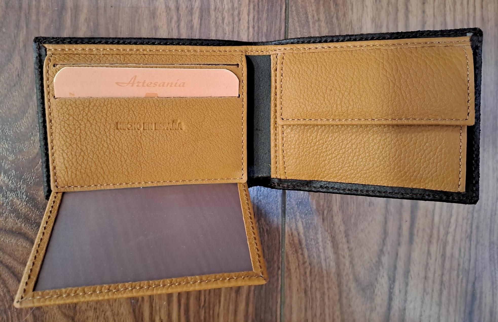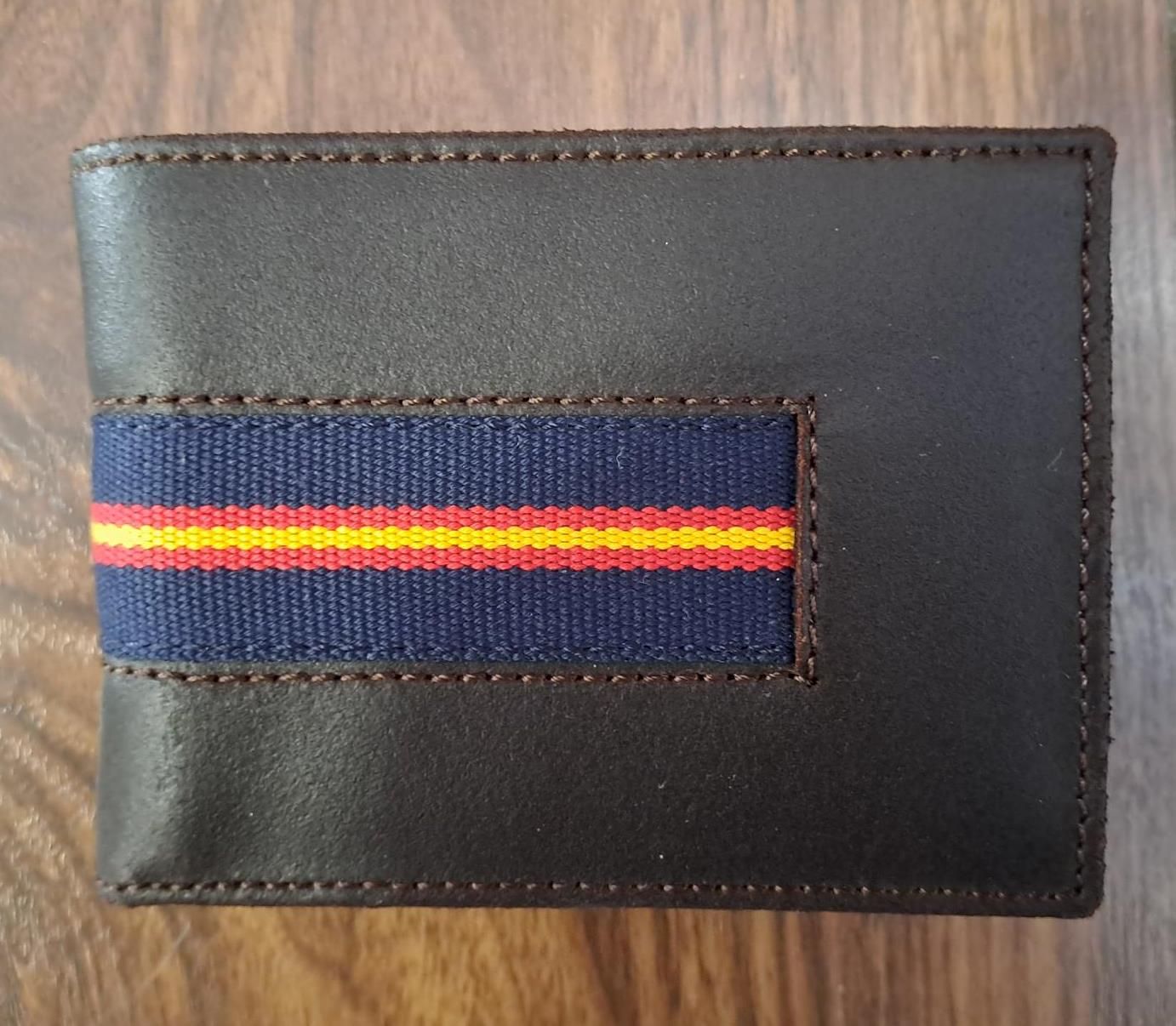 Preciosa y elegante cartera en piel de fabricación artesana, hecha en España, de color marrón, con una banderita de españa sobre lona azul rectangular en la parte exterior. Dispone de varios departamentos para billetes, tarjetas, fotografías, carnets, y con monedero. Con cierre de seguridad.