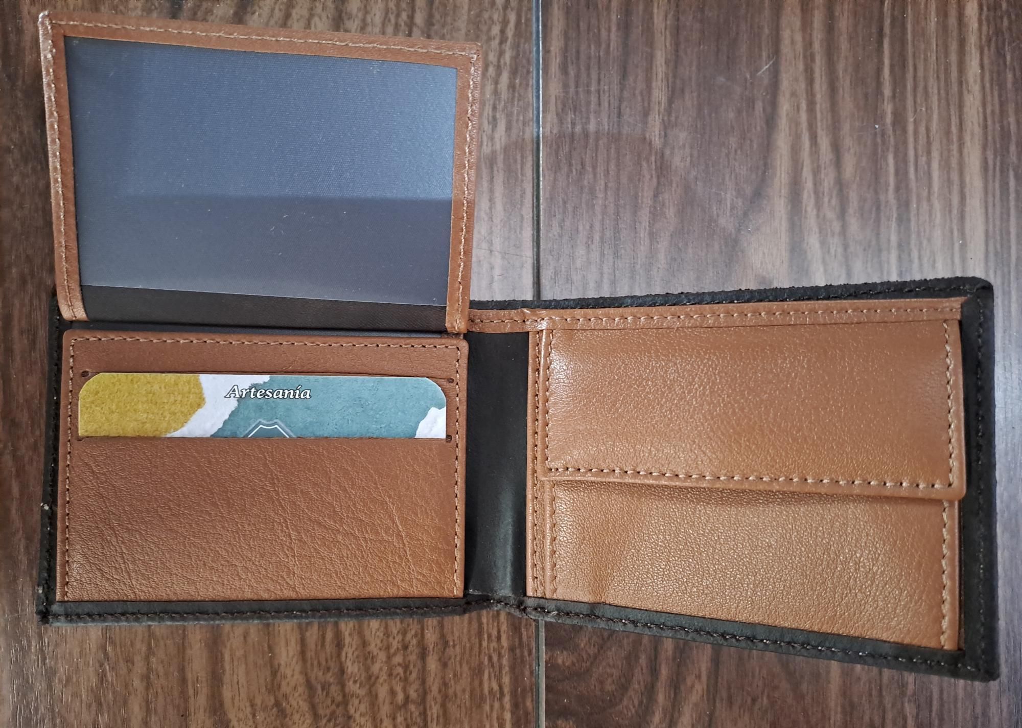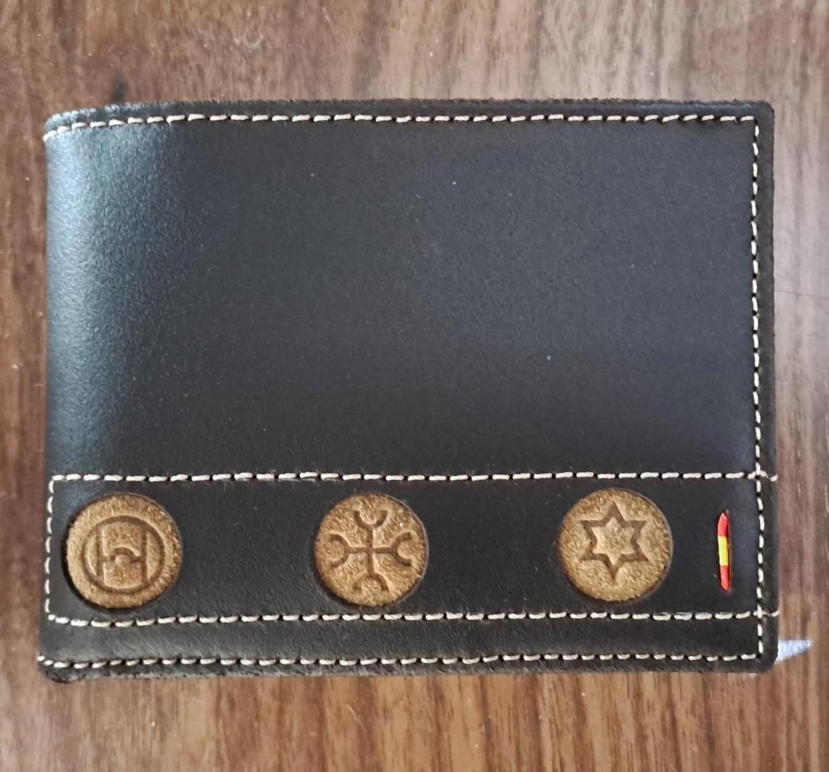 CR031 Cartera marrón oscuro de piel engrasada con grabado de hierros de lidia sobre monedas de serraje claro con una discreta bandera de España Artesanía Española