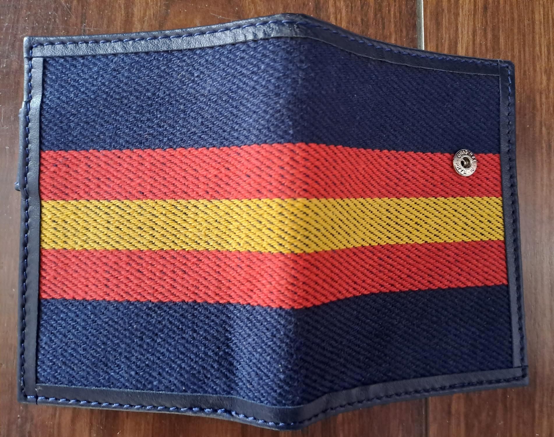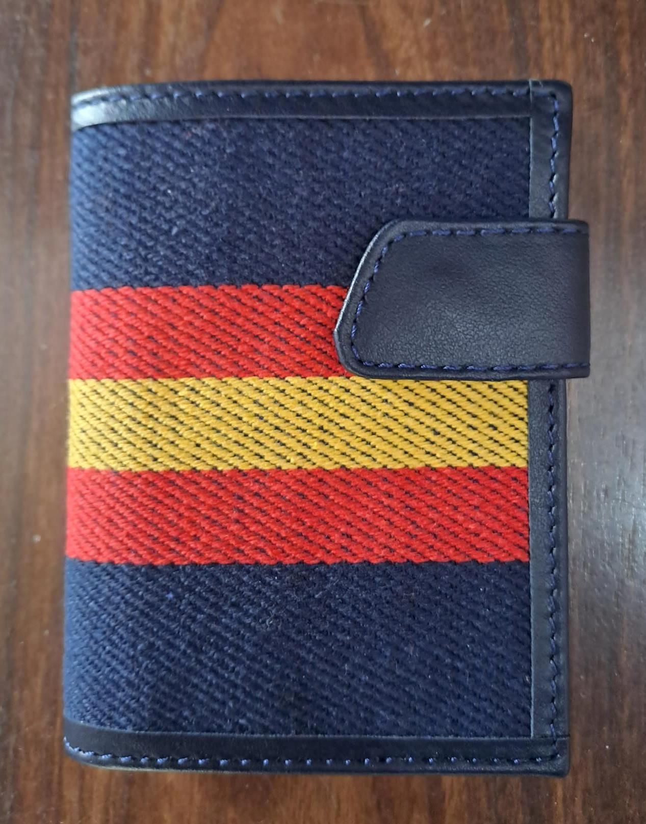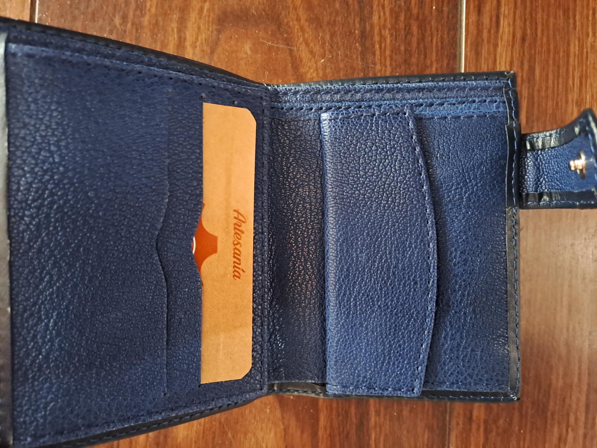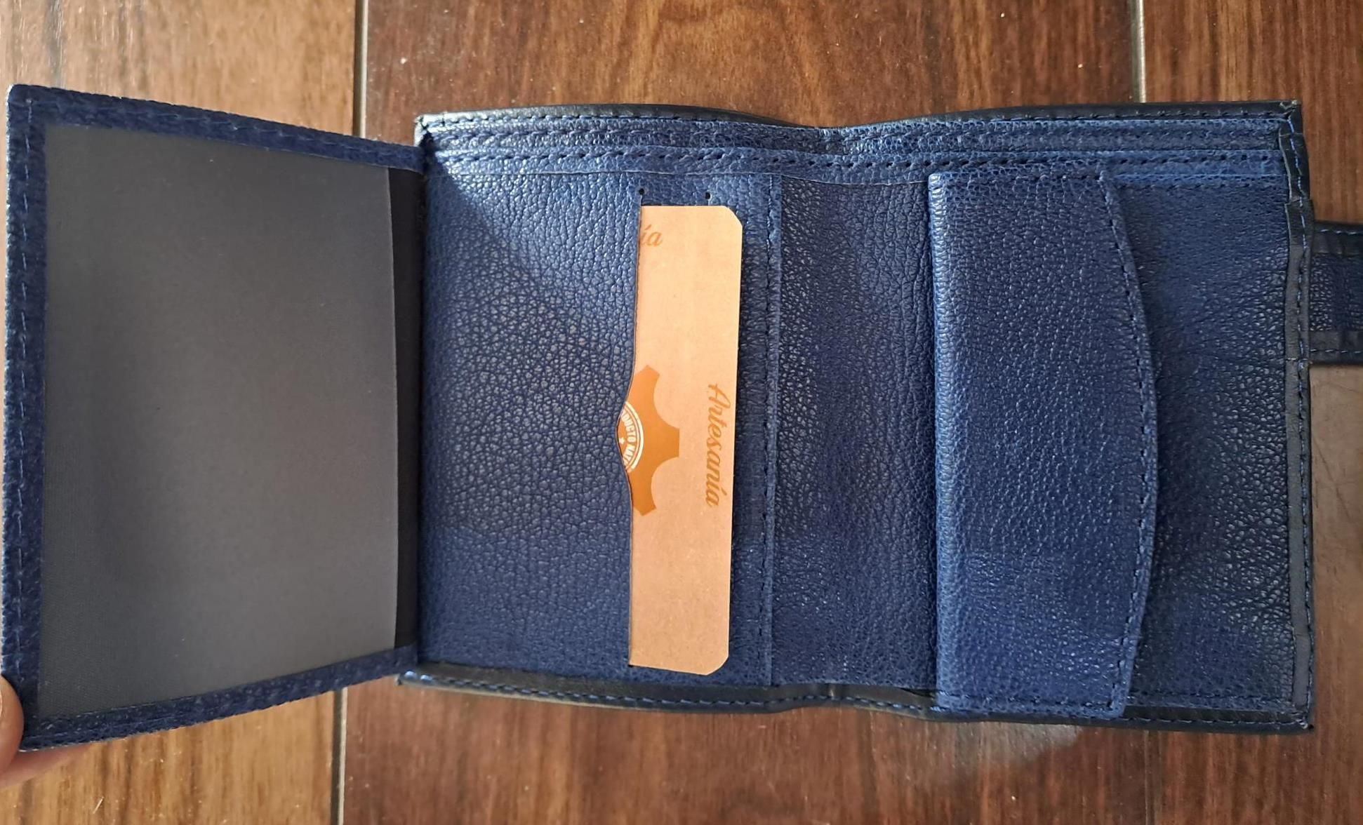 Preciosa y elegante cartera azul con una gran Bandera de España, exterior de lona e interior de cuero azul de Piel artesana española. Dispone de varios departamentos para billetes, tarjetas, fotografías, carnets, y con monedero, lleva cierre de seguridad, vertical.