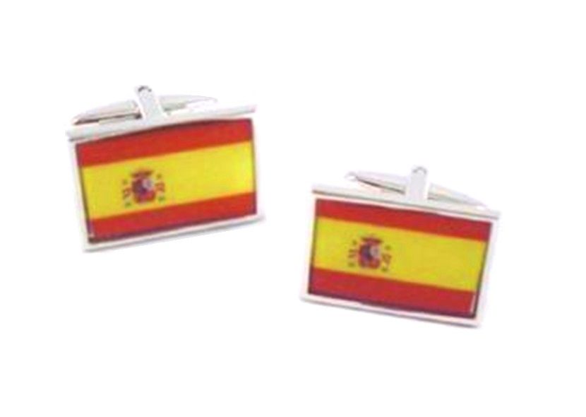 Bonito y colorido gemelo de rodio Gemelos de Bandera de España rectangular con escudo con base de rodio plateado con caja Elegance.