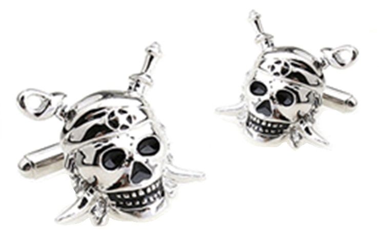 Elegante y original gemelo de rodio en fantasía dde calaveras piratas con pañuelo y espadas en rodio plateado con Caja Elegance.