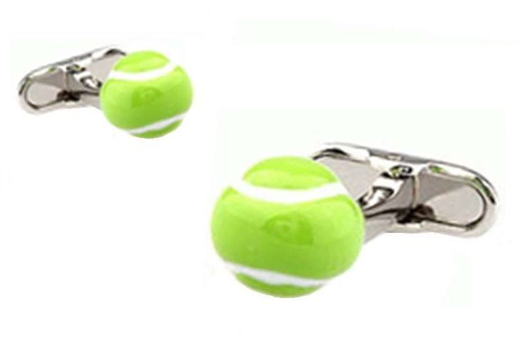 Elegante y original gemelo de rodio en fantasía de pelotas de tenis o padel bolas de juego de raqueta en rodio esmaltadas en color verde y raya blanca con Caja Elegance.