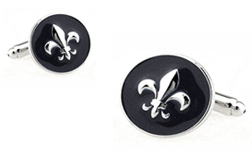 Elegante y original gemelo de rodio en fantasía de Flor de lis en plateado brillante cromado sobre fondo negro en gemelo circular de rodio con Caja Elegance