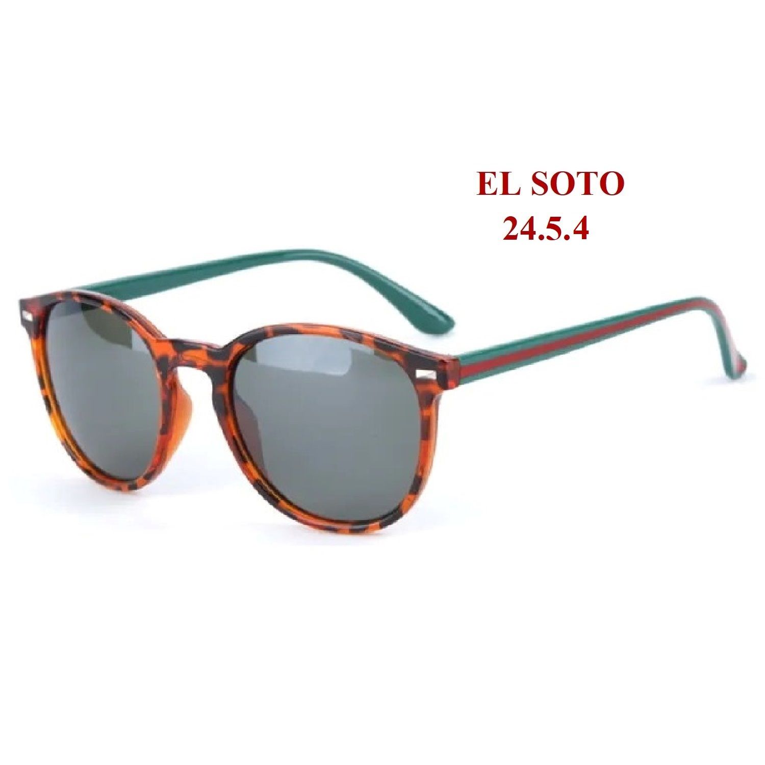 GS24.5.4 Gafas de sol con montura de pasta frontal animal print de leopardo y patillas en verde y rojo con cristales negros con índice de protección UV400
