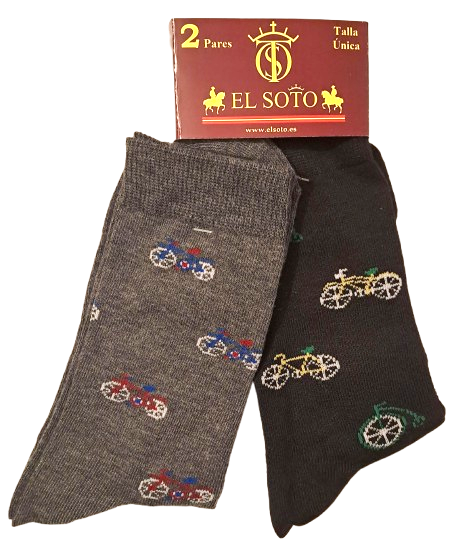 Lote de 2 pares de calcetines de Bicicletas y Monociclos azules y rojas sobre gris y verdes y amarillas sobre negro El Soto. Algodón Talla Única (39-46)