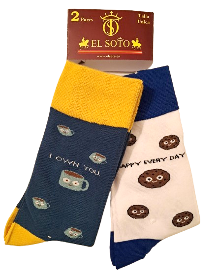 Lote de 2 pares de calcetines de Calcetines de taza de café celeste sobre fondo azul con talonera amarilla y pastas de chocolate sobre fondo beige claro y talonera azul con las frases de feliz todos los días (happy every day) El Soto. Algodón Talla Única (39-46)