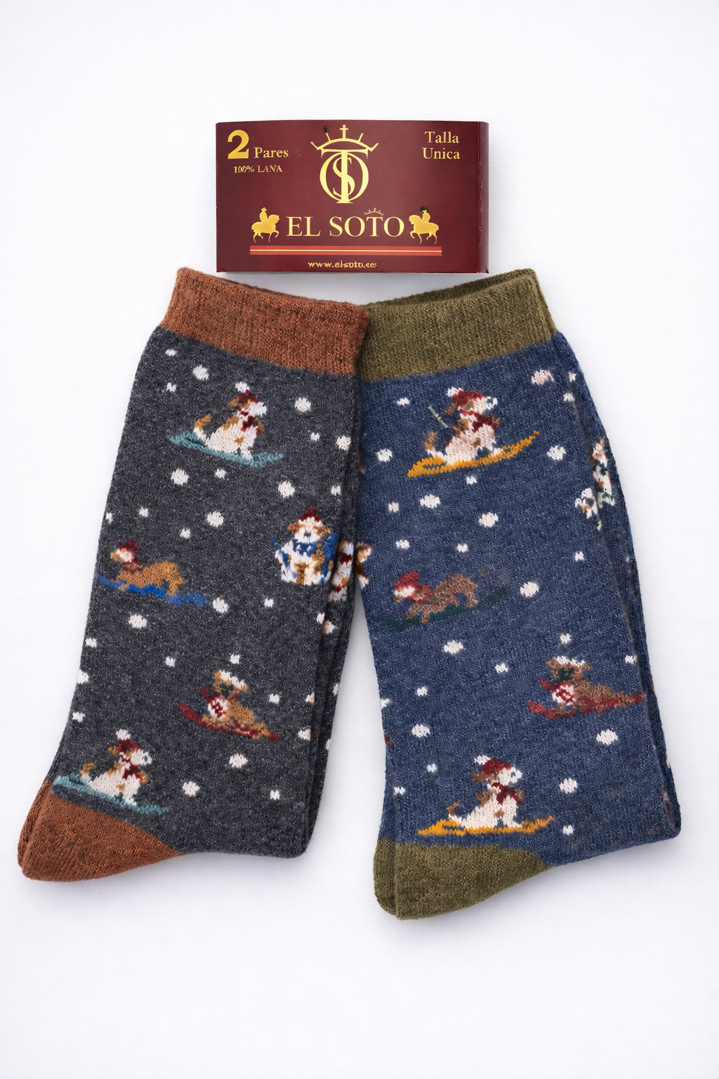 Lote de 2 pares de Calcetines originales y divertidos de Lana con dibujos navideños de perro esquiando en la nieva, en gris oscuro y azul con taloneras en contraste El Soto. 100% Lana Talla Única (39-46)