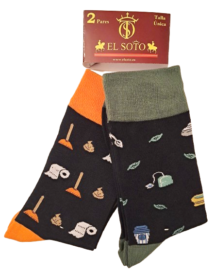 Lote de 2 pares de calcetines de papel higiénico, desatascador y... ejem! (kk) con talonera naranja y de infusiones, sobre de te, con talonera verde El Soto