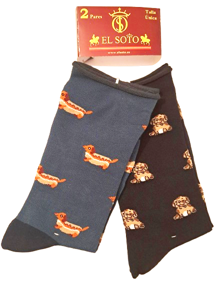 Lote de 2 pares de calcetines de Perrito salchicha metido en pan de HotDog sobre fondo azul y taloneras negras, y de cachorritos de perro sobre fondo negro, sin gomas arriba para que no hagan marcas en la piel. El Soto. Algodón Talla Única (39-46)