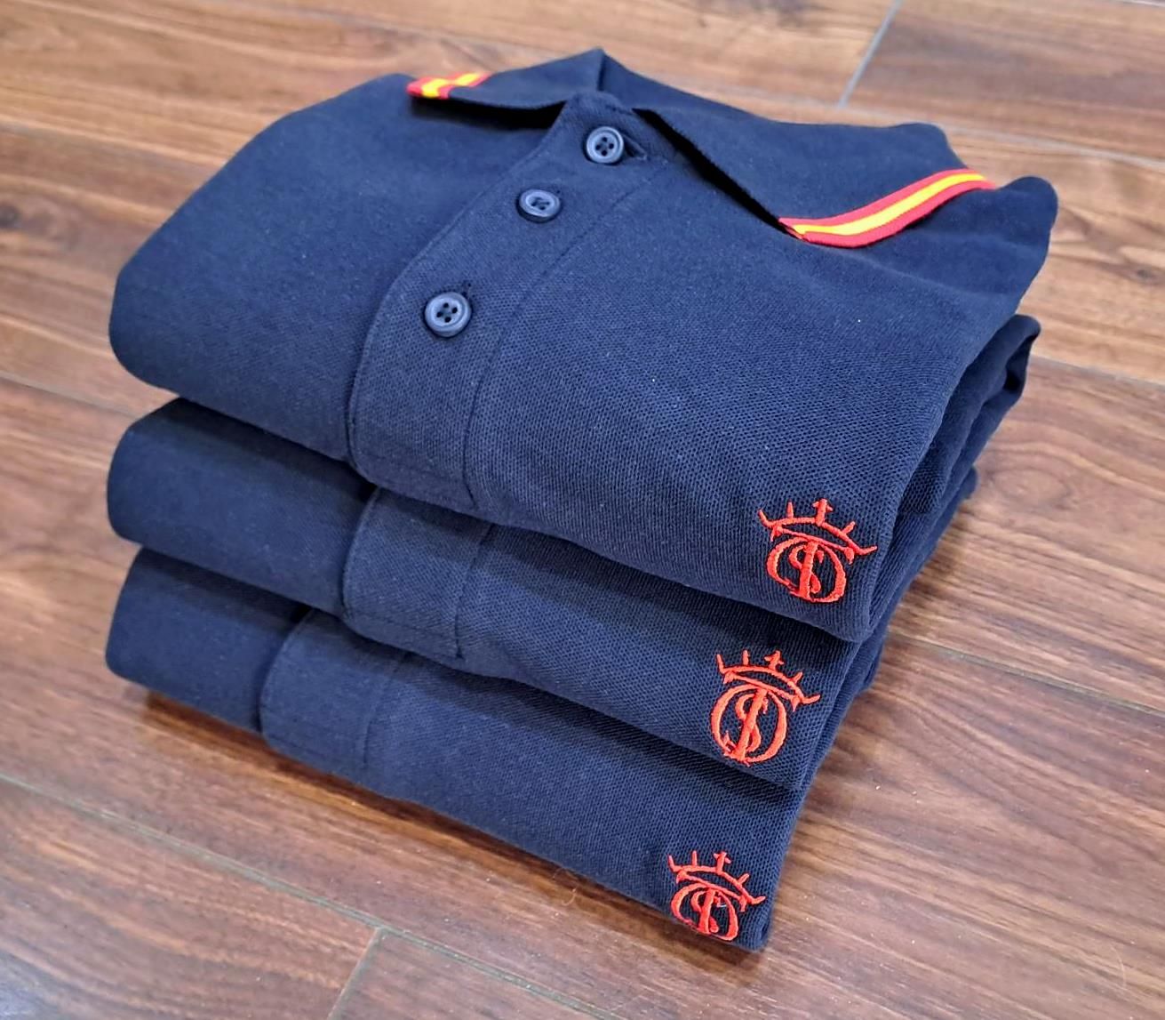 Polo Soto Classic con Bandera de España en el cuello y las mangas, Azul marino de hombre con bordado en rojo con el Hierro EL SOTO de manga corta 100% Algodón Piqué