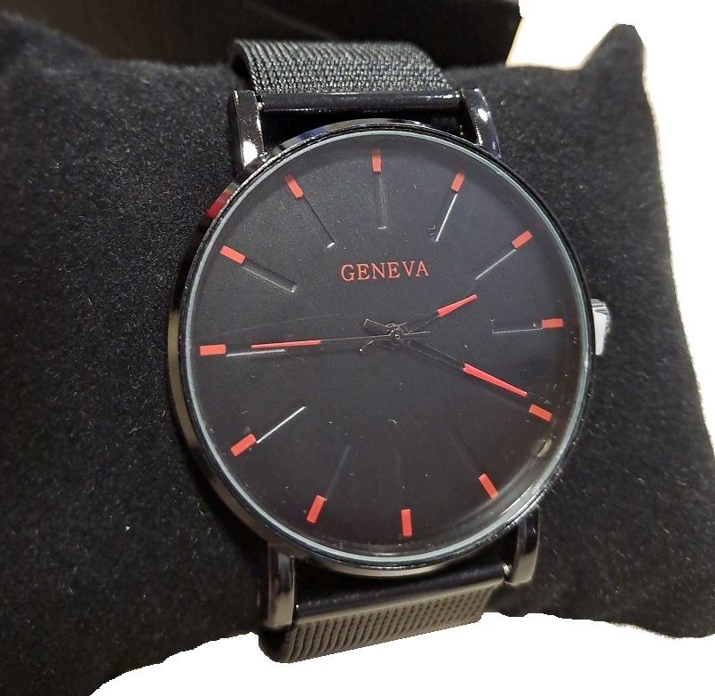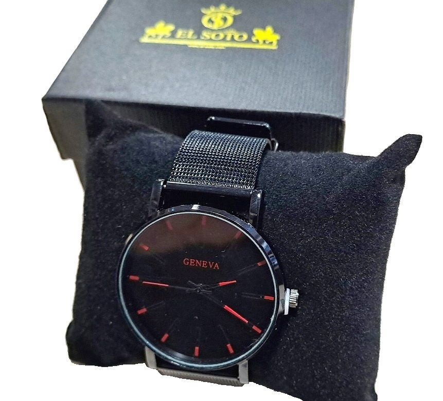 Reloj de pulsera en color negro con detalles en rojo, correa metálica negra analógico EL SOTO, viene presentado en caja negra, con almohada, EL SOTO, pila incluida.